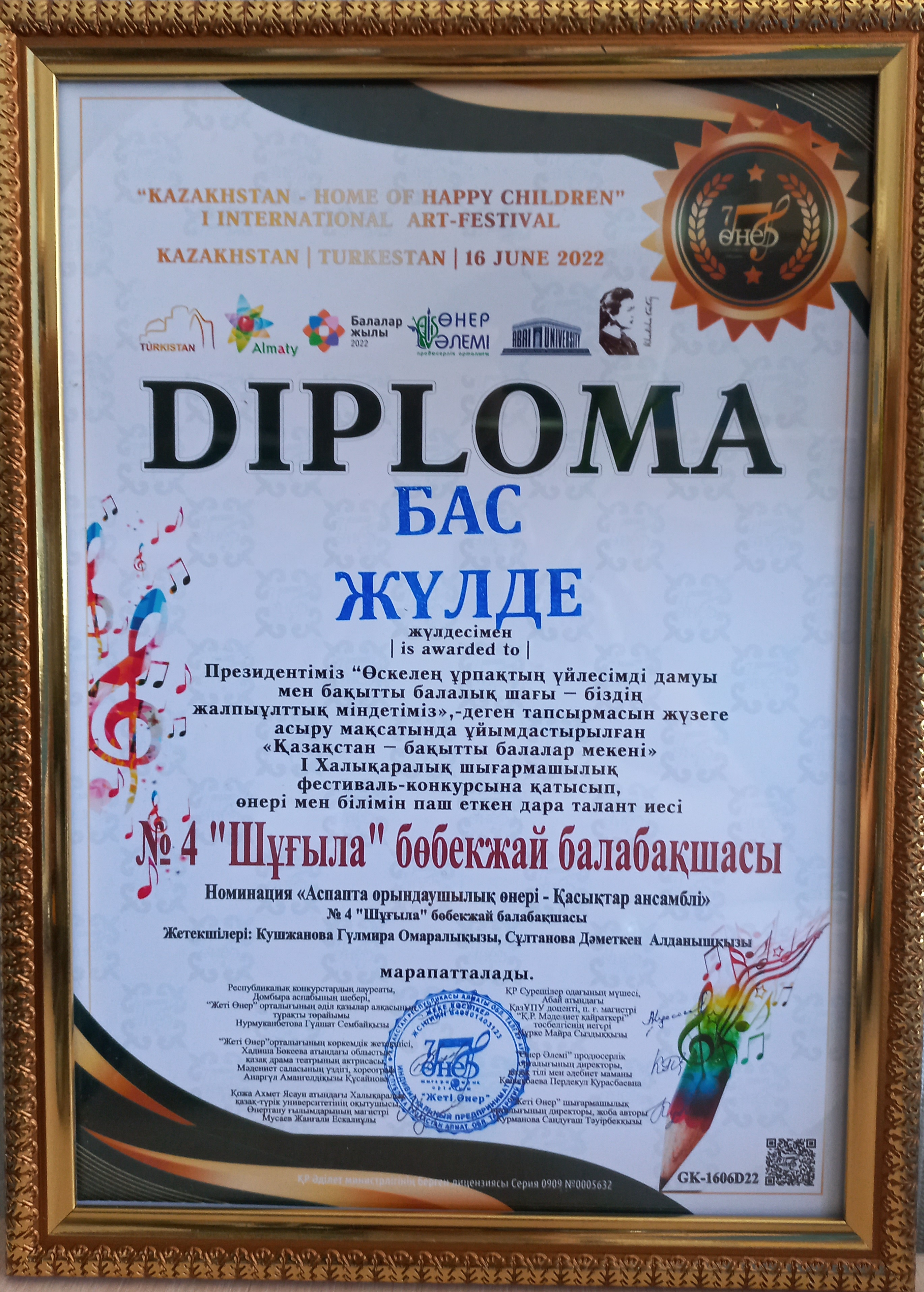 Президентіміз "Өскелең ұрпақтың үйлесімді дамуы мен бақытты балалық шағы-біздің жалпыұлттық міндетіміз" - деген тапсырмасын жүзеге асыру мақсатында ұйымдастырылған "Қазақстан-бақытты балалар мекені" атты Түркістан облысында өткен І Халықаралық шығармашылық фестиваль-конкурсына барып, "Аспапта орындаушылық өнері-қасықтар ансамблі" номинациясы бойынша балабақшамыздың бүлдіршіндері "Бас жүлде" иеленді.